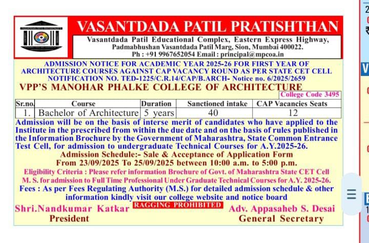 ADMISSION NOTICE [5Years Bachelor Of Architecture Course ]